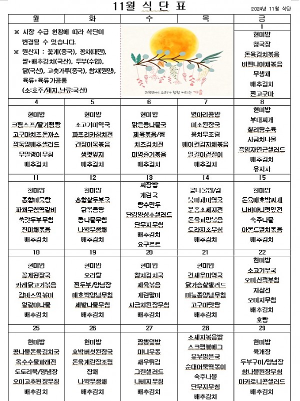 2024년 11월 식단표 ^^ 페이지 정보 작성자 관리자 작성일24-10-31 13:19 조회2,186회 댓글0건 이전글 다음글 목록 본문 힘차게 달리다 보니 벌써 11월이 되었습니다. 11월에도 맛있게 먹고 힘내서 열심히 일하겠습니다. ^^ 이전글 다음글 목록