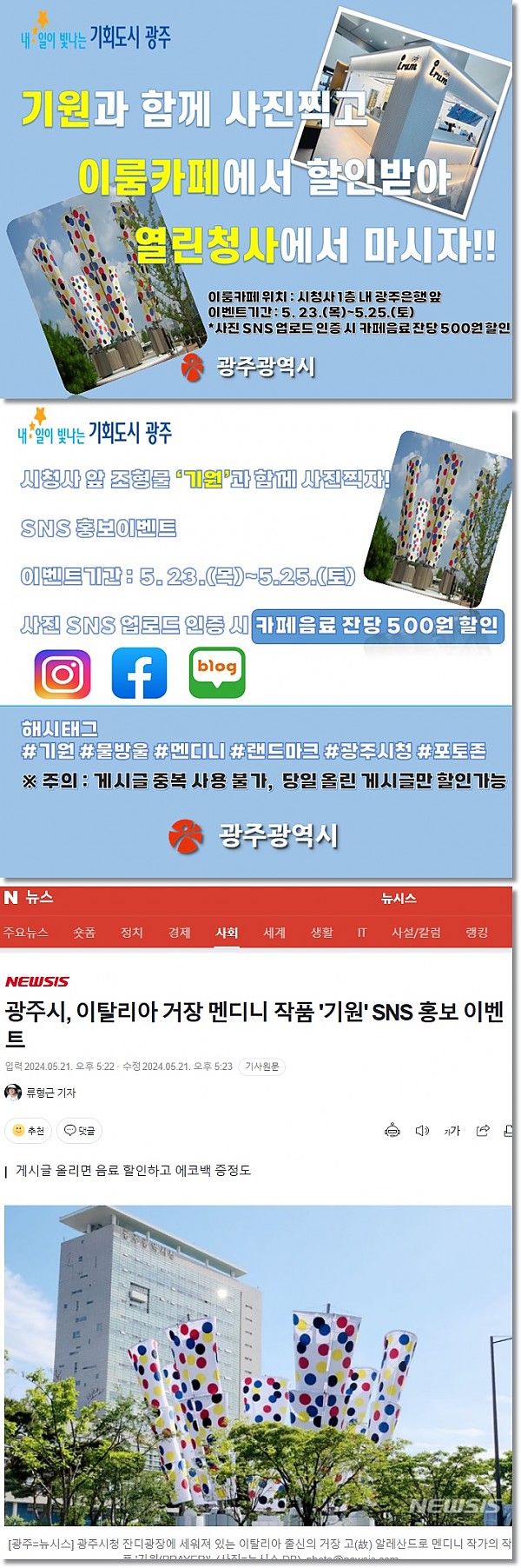 이룸카페 시청점 광주시민의날 할인 행사 페이지 정보 작성자 관리자 작성일24-06-10 15:14 조회3,199회 댓글0건 이전글 다음글 목록 본문 광주광역시 시민의날 행사 일환으로 시청사 앞 조형물 "기원"과 함께 사진찍고 SNS 인증 시 음료 할인행사를 진행했습니다. 이전글 다음글 목록