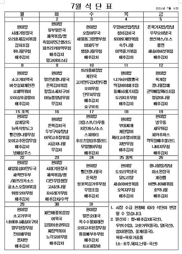 2024년 7월 식단표 ^^ 페이지 정보 작성자 관리자 작성일24-06-27 14:55 조회2,739회 댓글0건 이전글 다음글 목록 본문 무더운 여름이지만 맛있게 먹고 힘 내서 7월에도 열심히 일하겠습니다! ^^ 이전글 다음글 목록