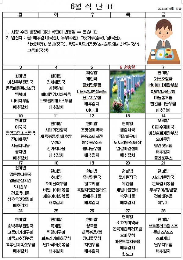 2024년 6월 식단표 ^^ 페이지 정보 작성자 관리자 작성일24-05-30 18:47 조회3,427회 댓글0건 이전글 다음글 목록 본문 여름이 왔습니다! 여름이 왔어요! 땀이 나서 덥고 힘들지만 맛있게 먹고 힘 내서 6월도 잘 이겨내보겠습니다 ~^^ 이전글 다음글 목록