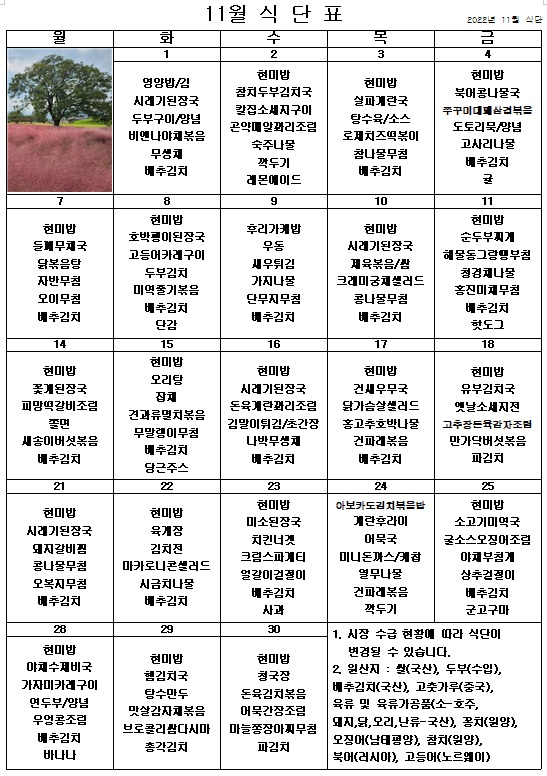 2022년 11월 식단표 ^^ 페이지 정보 작성자 관리자 작성일22-10-31 18:33 조회4,101회 댓글0건 이전글 다음글 목록 본문 11월에는 우리 가족들의 의견을 최대한 많이 반영해보도록 하겠습니다. 맛있게 먹고 건강하게 생활합시다! ^^ 이전글 다음글 목록
