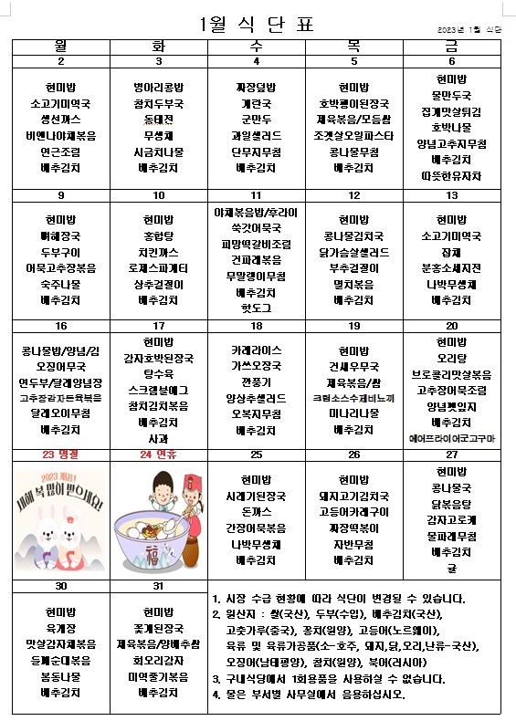 2023년 1월 식단표 ^^ 페이지 정보 작성자 관리자 작성일22-12-30 11:06 조회3,848회 댓글0건 이전글 다음글 목록 본문 내년에도 힘차게 달려봅시다! 이전글 다음글 목록