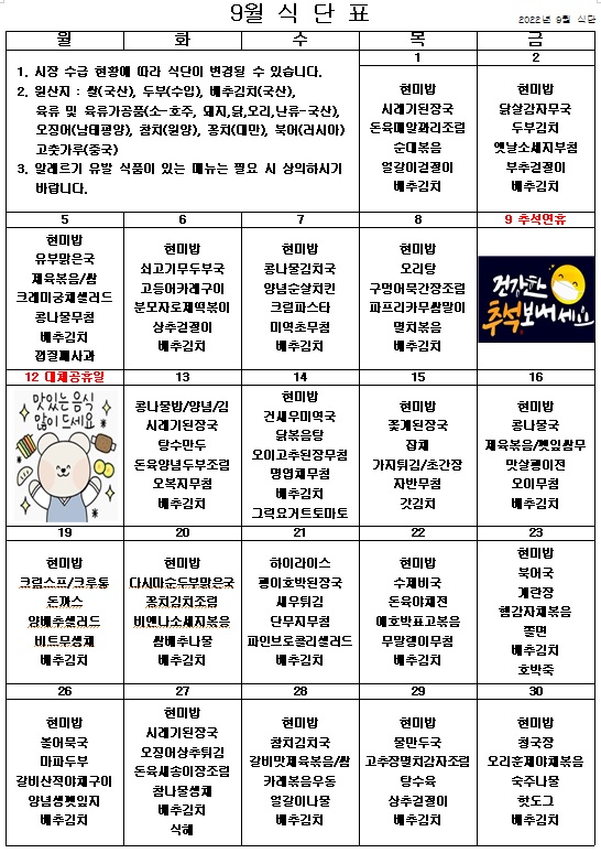 2022년 9월 식단표 ^^ 페이지 정보 작성자 관리자 작성일22-08-30 18:35 조회4,011회 댓글0건 이전글 다음글 목록 본문 보름달처럼 둥근 마음으로 풍성한 식단을 준비했습니다. 맛있게 먹고 모두의 건강을 지킬 수 있도록 열심히 노력하겠습니다. ^^ 이전글 다음글 목록
