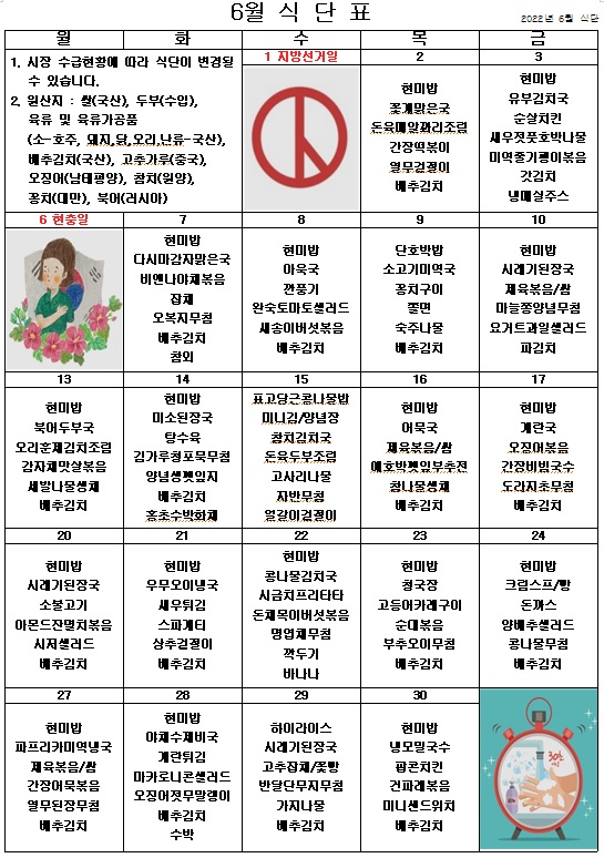 2022년 6월 식단표 ^^ 페이지 정보 작성자 관리자 작성일22-05-31 15:04 조회4,056회 댓글0건 이전글 다음글 목록 본문 더욱 알차고 맛있는 식단을 제공하도록 노력하겠습니다. ^^ 이전글 다음글 목록