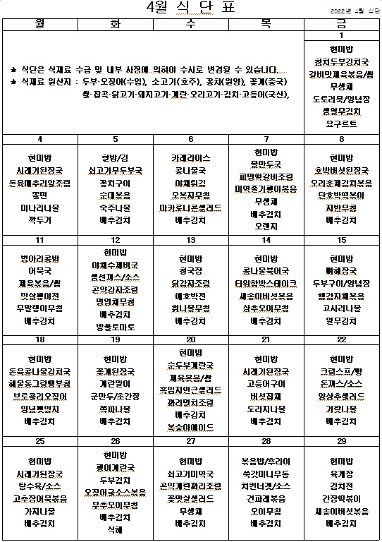 2022년 4월 식단표 ^^ 페이지 정보 작성자 관리자 작성일22-03-30 19:12 조회4,281회 댓글0건 이전글 다음글 목록 본문 코로나가 아무리 심해져도 우리의 열정을 막을순 없죠. 맛있고 건강한 식단으로 힘을 내서 슬기롭게 코로나를 이겨내보아요. ^^ 이전글 다음글 목록