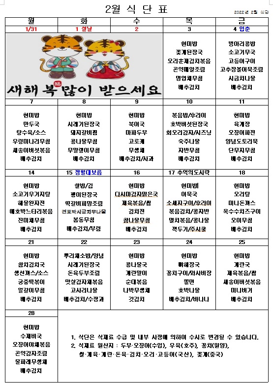 2022년 2월 식단표 ^^ 페이지 정보 작성자 관리자 작성일22-01-27 15:59 조회4,354회 댓글0건 이전글 다음글 목록 본문 맛있게 먹고 힘을 내서 코로나를 이겨내봐요! ^^ 이전글 다음글 목록