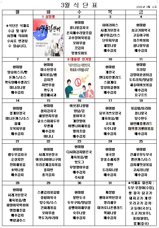 2022년 3월 식단표 ^^