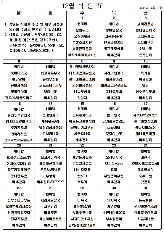 2021년 12월 식단표 ^^ 페이지 정보 작성자 관리자 작성일21-11-30 09:10 조회4,291회 댓글0건 이전글 다음글 목록 본문 어느덧 연말이 코 앞이네요. 맛있게 먹고 건강하게 지내면서 위드 코로나 시대를 현명하게 잘 이겨내봐요! ^^ 이전글 다음글 목록