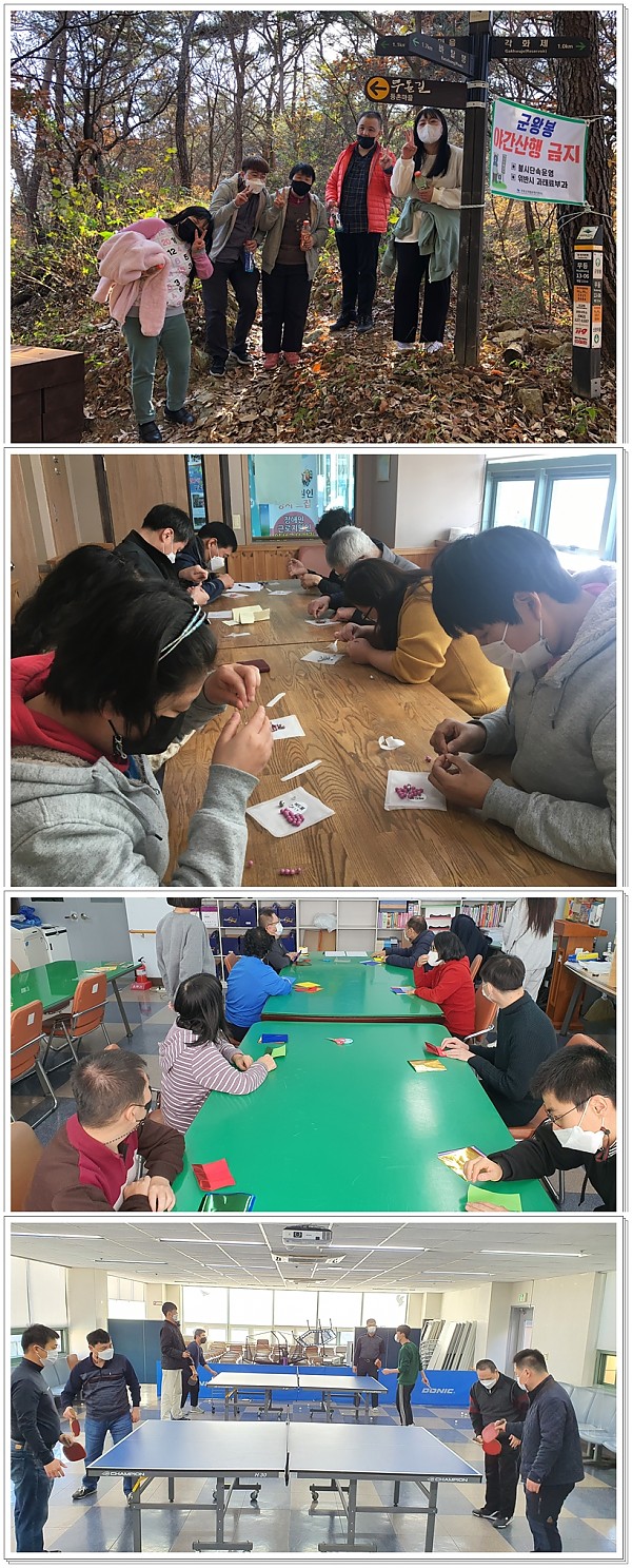 11월 동아리활동 페이지 정보 작성자 관리자 작성일21-12-20 09:18 조회4,252회 댓글0건 이전글 다음글 목록 본문 등산, 십자수, 종이접기, 탁구 프로그램을 이용인 스스로 진행될 수 있도록 하고 있습니다. 이전글 다음글 목록