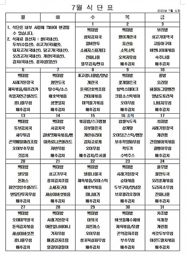2020년 7월 식단 ^^ 페이지 정보 작성자 관리자 작성일20-06-30 17:27 조회4,708회 댓글0건 이전글 다음글 목록 본문 코로나바이러스가 우리 주변에도 서성이고 있어서 무섭습니다. 그래도 맛있게 먹고 화이팅! ^^ 이전글 다음글 목록