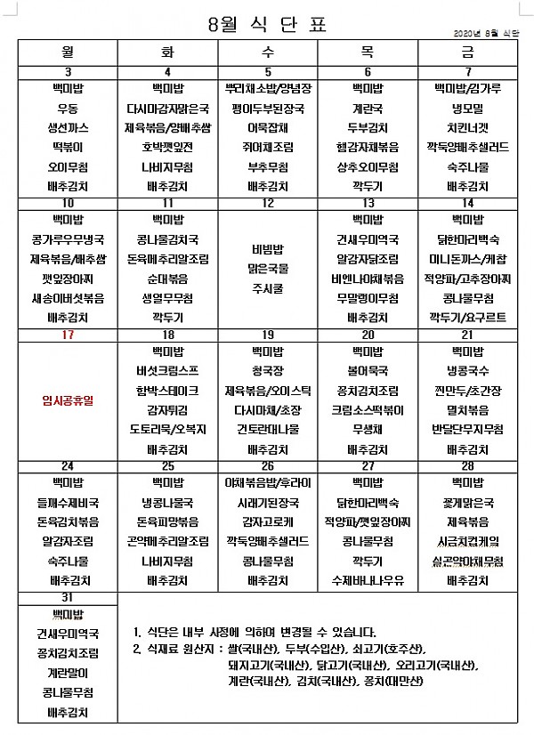 8월 식단표 페이지 정보 작성자 관리자 작성일20-08-13 16:09 조회4,737회 댓글0건 이전글 다음글 목록 본문 맛있게 먹고 힘내요! ^^ 사회적 거리 두기 1단계. 이전글 다음글 목록