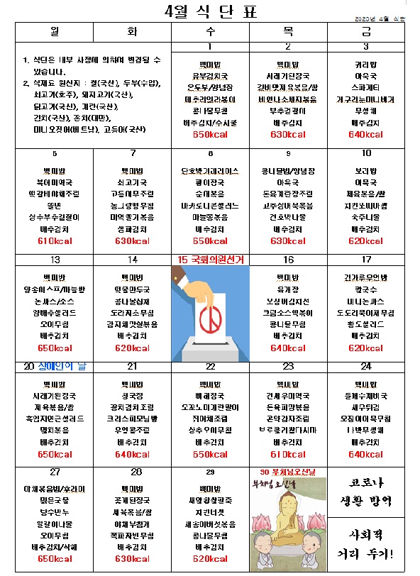 2020년 4월 식단 페이지 정보 작성자 관리자 작성일20-04-01 18:28 조회5,035회 댓글0건 이전글 다음글 목록 본문 코로나 바이러스를 잘 이겨냅시다! 사회적 거리 두기 실천 식후 식당 방역 소독 철저 이행 이전글 다음글 목록