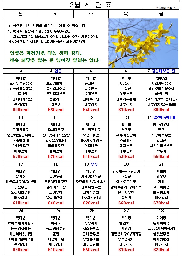 2020년 2월 식단표 페이지 정보 작성자 관리자 작성일20-02-03 19:04 조회4,944회 댓글0건 이전글 다음글 목록 본문 즐거운 점심시간 ^^ 맛있는 음식으로 활기찬 하루를 보내요! 이전글 다음글 목록