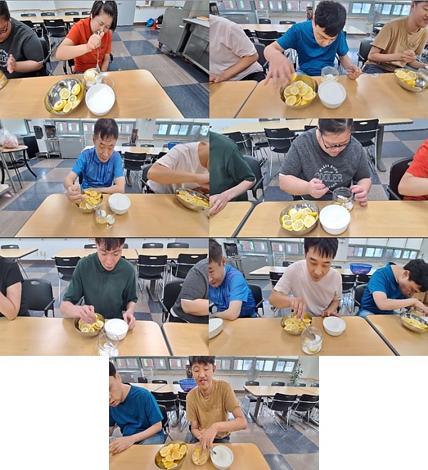 이번 달 요리 시간에는 레몬청을 직접 만들어보았습니다. 잘 씻어서 얇게 썰어놓은 레몬의 씨앗을 빼고,