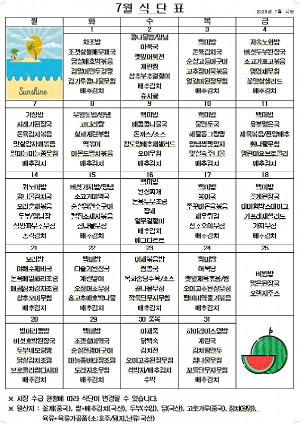 2025년 7월 식단표 ^^ 페이지 정보 작성자 관리자 작성일25-06-30 18:12 조회1,231회 댓글0건 이전글 다음글 목록 본문 무더운 여름에도 맛있게 먹고 힘 내서 열심히 일해보겠습니다! ^^ 이전글 다음글 목록