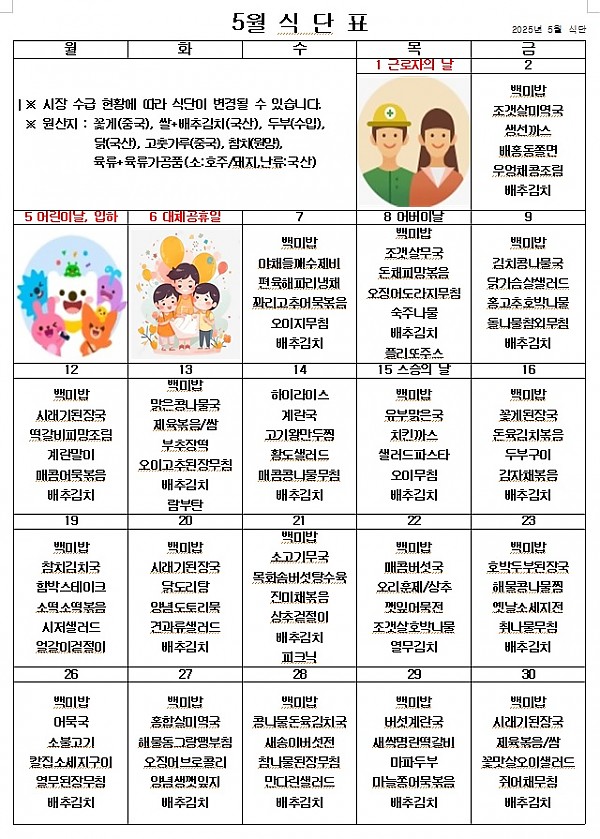2025년 5월 식단표 ^^ 페이지 정보 작성자 관리자 작성일25-04-29 15:51 조회1,332회 댓글0건 이전글 다음글 목록 본문 여름같이 더운 5월입니다. 5월에도 맛있게 먹고 힘 내서 열심히 일하겠습니다! ^^ 이전글 다음글 목록