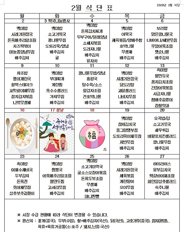 2026년 2월 식단표 ^^ 페이지 정보 작성자 관리자 작성일26-01-29 14:46 조회216회 댓글0건 이전글 다음글 목록 본문 2월에는 입춘도 있고, 설 명절도 있습니다. 2월에도 건강한 음식을 맛있게 먹고 열심히 일하겠습니다. 이전글 다음글 목록