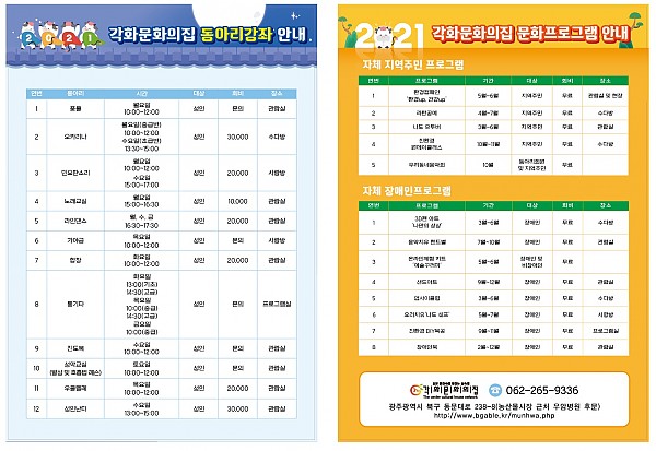 21년 동아리활동 안내 및 프로그램 안내 페이지 정보 작성자 정관용 작성일21-01-04 15:34 조회8,275회 댓글0건 이전글 다음글 목록 본문 21년도 동아리활동 안내 및 프로그램 안내 누구나 참여가능하고 배우고 싶은 분들은 사전에 연락바랍니다. (265-9336 각화문화의집) 이전글 다음글 목록