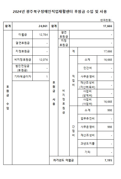 2024년 광주북구장애인직업재활센터 후원금 수입 및 사용내역 공고 페이지 정보 작성자 관리자 작성일25-03-11 16:06 조회8,304회 댓글0건 이전글 다음글 목록 본문 사회복지법인 및 사회복지시설 재무․회계규칙 제41조의 6의 규정에 의거하여 2024년 광주북구장애인직업재활센터 후원금 수입 및 사용 내역을 다음과 같이 공개합니다. 이전글 다음글 목록