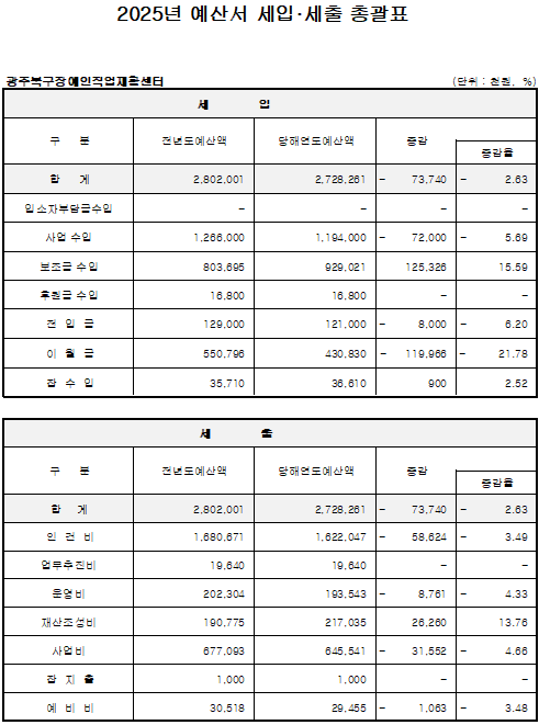 2. 공고사항 : 2025 광주북구장애인직업재활센터 세입·세출 예산서